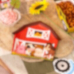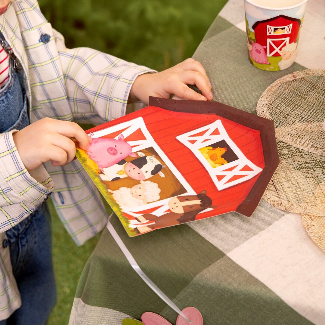 6 paptallerkener med bondegårdstema, der gør borddækningen ekstra sjov til børnefødselsdagen. Tallerkenerne er formet som en rød lade og er prydet med søde bondegårdsdyr som gris, ko, får og hest, hvilket gør dem til en sjov detalje på fødselsdagsbordet.