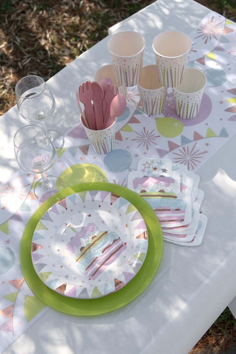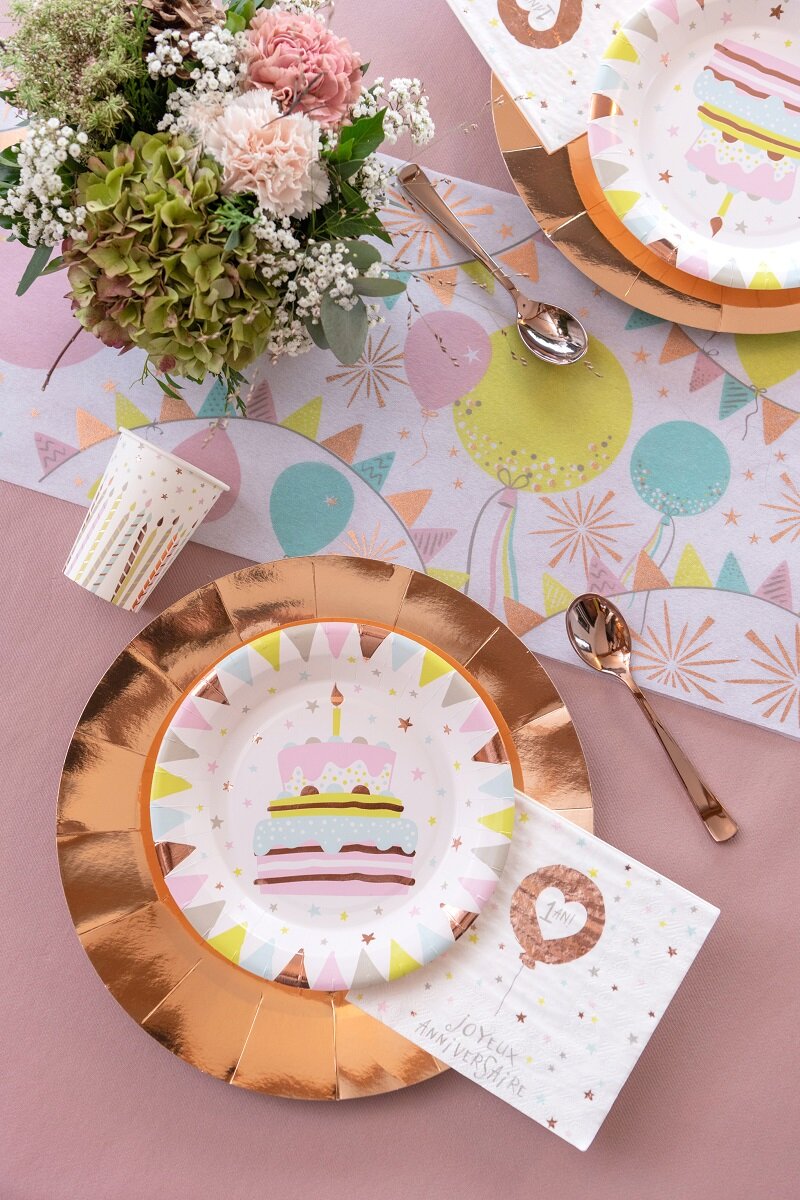 10 stk. paptallerkener med festligt motiv af en fødselsdagskage omgivet af detaljer i rosaguld, der får tallerkenerne til at føles luksuriøse. Disse tallerkenerne er perfekte, hvis du vil arrangere en ekstra festlig børnefødselsdag.