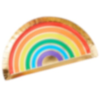 8 stk. flotte regnbueformede tallerkner med kanter i guldfolie og med motivet af en regnbue. Tallerknerne er af papir og er ca. 27 x 16 cm.