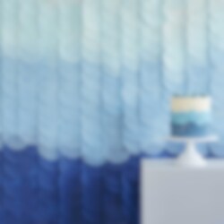Baggrunden måler ca. 180 cm i højden og består af 18 papircirkler i forskellige nuancer af blå og lyseblå.