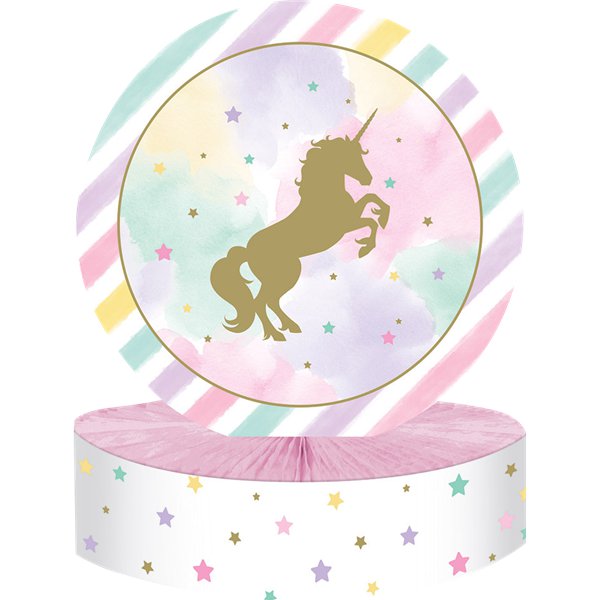 Flot borddekoration i honeycomb med motiv af en enhjørning i guldfolie. En perfekt dekoration at have på bordet til enhjørning festen. Borddekorationen er ca 23 x 30 cm stor