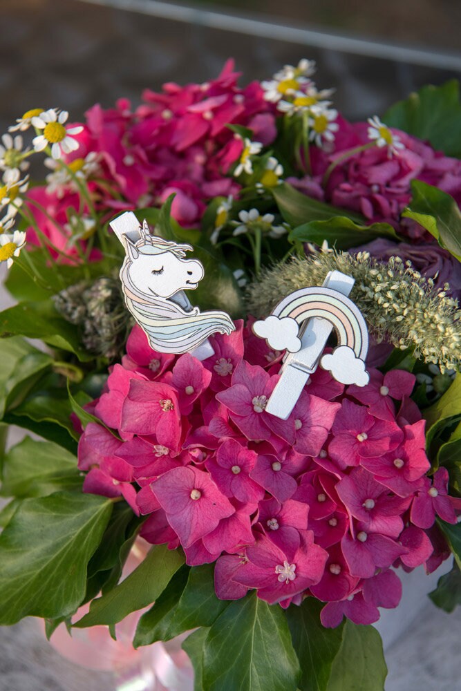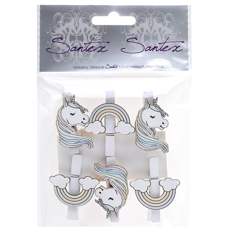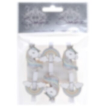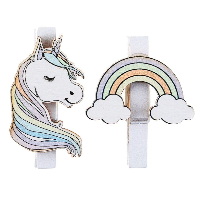 6 hvide tøjklemmer med motiver af farverige enhjørninger og regnbuer. Perfekt til at dekorere din fest eller dit værelse med. Klemmerne er lavet af træ, 4 x 5 cm, og du får 3 enhjørninger og 3 regnbuer.