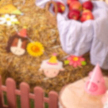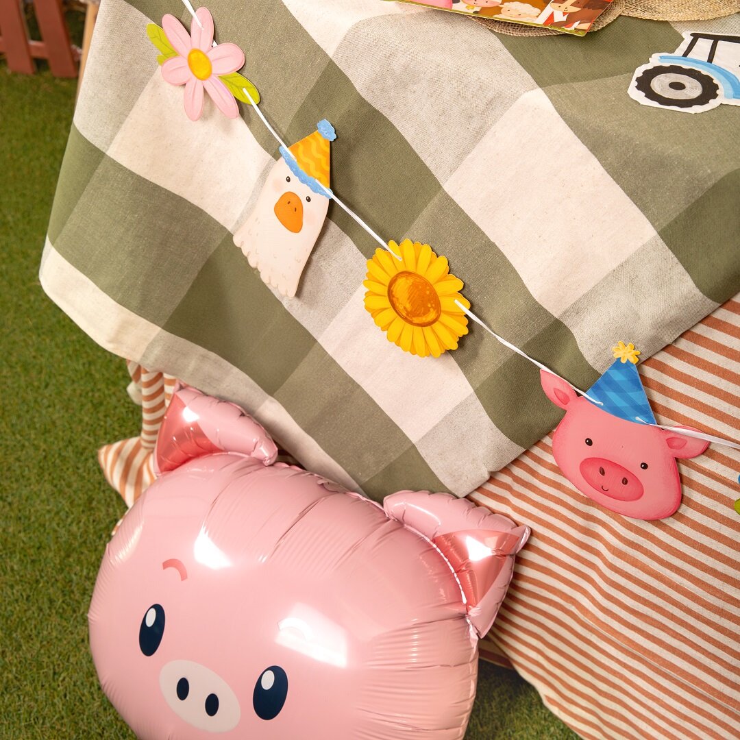 Papirguirlande med søde bondegårdsdyr og blomster, der bliver en charmerende dekoration til børnefødselsdagen. De legesyge motiver med høne, hest, får, gås, gris, ko og farverige blomster passer perfekt til at skabe en varm og festlig stemning til en fødselsdag med bondegårdstema.