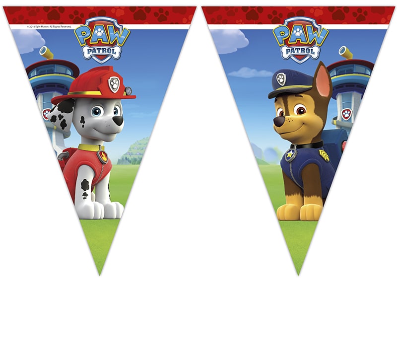 Super fin flagguirlande med motiv på begge sider af Chase og Marshall fra Paw Patrol. En sjov dekoration at have med til festen. Flagbanneret er fremstillet af plast og er ca. 2,3 meter langt.
