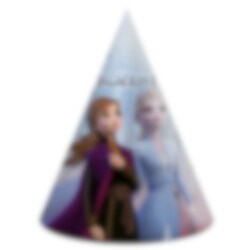 6 festhatte med et sejt motiv fra Frozen 2. Sjovt at dele ud til dine venner under festen med Frozen 2 tema. Hattene er ca. 19 cm høje og sættes på plads med en elastik.