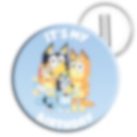 En badge med motiv af Bluey og teksten 'It's My Birthday'. Perfekt til fødselsdagsbarnet at bære og fejre sin specielle dag. Badgen har en diameter på 6 cm.
