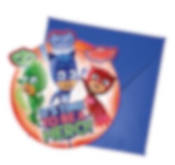 6 stk. formskårede invitationer med Pyjamasheltenes motiv. Invitationerne er ca 10 x 11 cm store og alt tekst er på engelsk. Pakken indeholder også 6 stk blå kuverter.