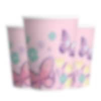 8 lyserøde papirkrus, med hvide kanter og med motiver af smukke sommerfugle, der er omringet af blomster. Gør bordpyntet ekstra flot med disse. Krusene er ca. 10 cm høje og rummer ca. 250 ml.