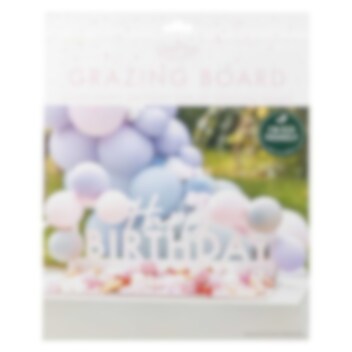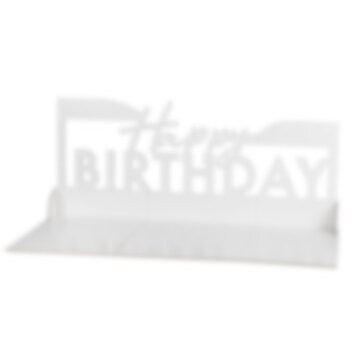 Pakken indeholder: 1 buffetfad med teksten "Happy Birthday" (ca. 63 cm bredt og ca. 26 cm højt), 20 stk. Limpletter, 2 støtter med lim for nem samling.