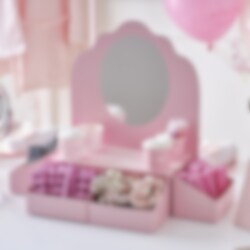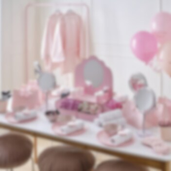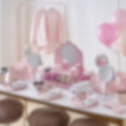 Giv din fest en luksuriøs touch med dette fantastiske slik- og snackstativ i form af et sminkebord. Perfekt til en sjov temafest, med lyserøde prikkede kasser, søde slik skåle og et spejl for ekstra glamour. Fyld den med dine favoritsnacks og lad festen begynde!