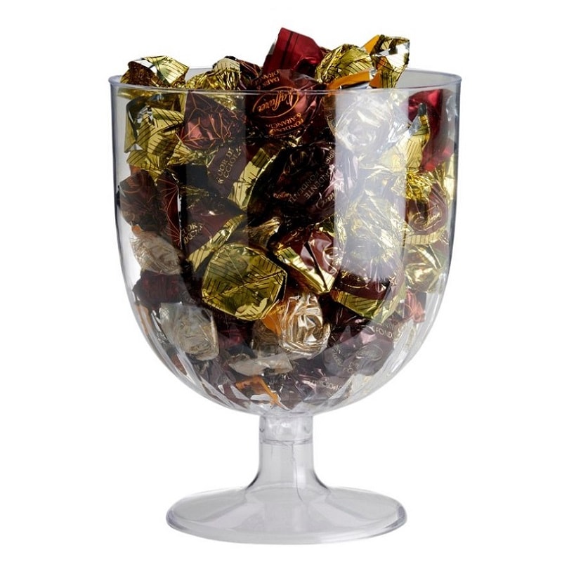 Denne elegante slikskål af plast er 20 cm høj og 16 cm bred. Den er perfekt til at servere slik eller andre små snacks i på en slikbuffet. At den står på fod giver en luksuriøs følelse, der passer ind i alle typer dekorationstemaer. Det er en praktisk og samtidig dekorativ detalje til enhver festlig lejlighed.