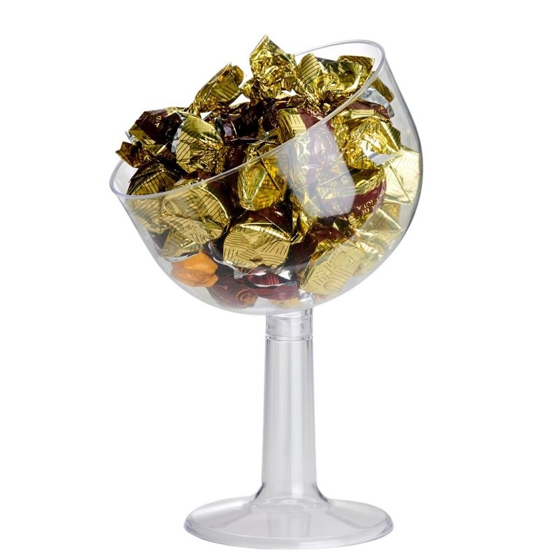 Denne elegante slikskål af plast er 26 cm høj og 16 cm bred. Den er perfekt til at servere slik eller andre små snacks i på en slikbuffet. At den står på fod giver en luksuriøs følelse, der passer ind i alle typer dekorationstemaer. Det er en praktisk og samtidig dekorativ detalje til enhver festlig lejlighed.