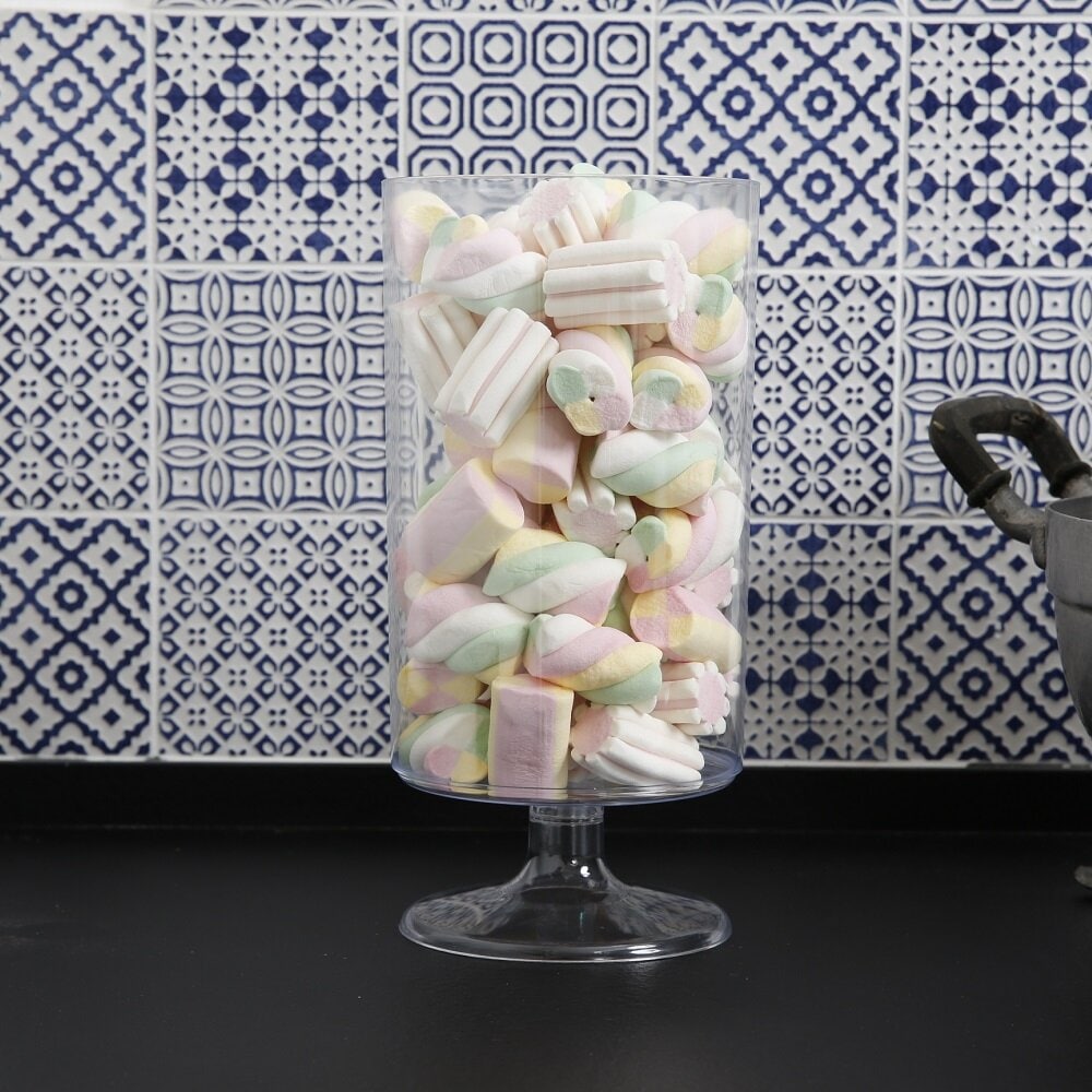 Denne elegante slikskål af plast er 25 cm høj og 16 cm bred. Den er perfekt til at servere slik eller andre små snacks i på en slikbuffet. At den står på fod giver en luksuriøs følelse, der passer ind i alle typer dekorationstemaer. Det er en praktisk og samtidig dekorativ detalje til enhver festlig lejlighed.