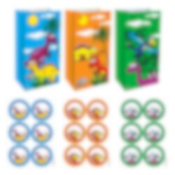 12 stk slikposer med matchende klistermærker. Poserne sælges usorterede og findes i farverne på billedet. Det betyder, at du enten får 12 blå, 12 orange eller 12 grønne poser med dinosaurmotiver og tilsvarende klistermærker. Uanset hvilken farve du får, vil disse smukke slikposer blive værdsat til dit børnefødselsdag.