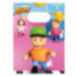 4 slikposer af papir med farverigt motiv fra Stumble Guys, hvor tre figurer løber frem på en klassisk forhindringsbane i spillets legende stil. Perfekte at fylde med slik, småt legetøj eller sjove overraskelser, som børnene kan tage med sig hjem efter børnefødselsdagen.