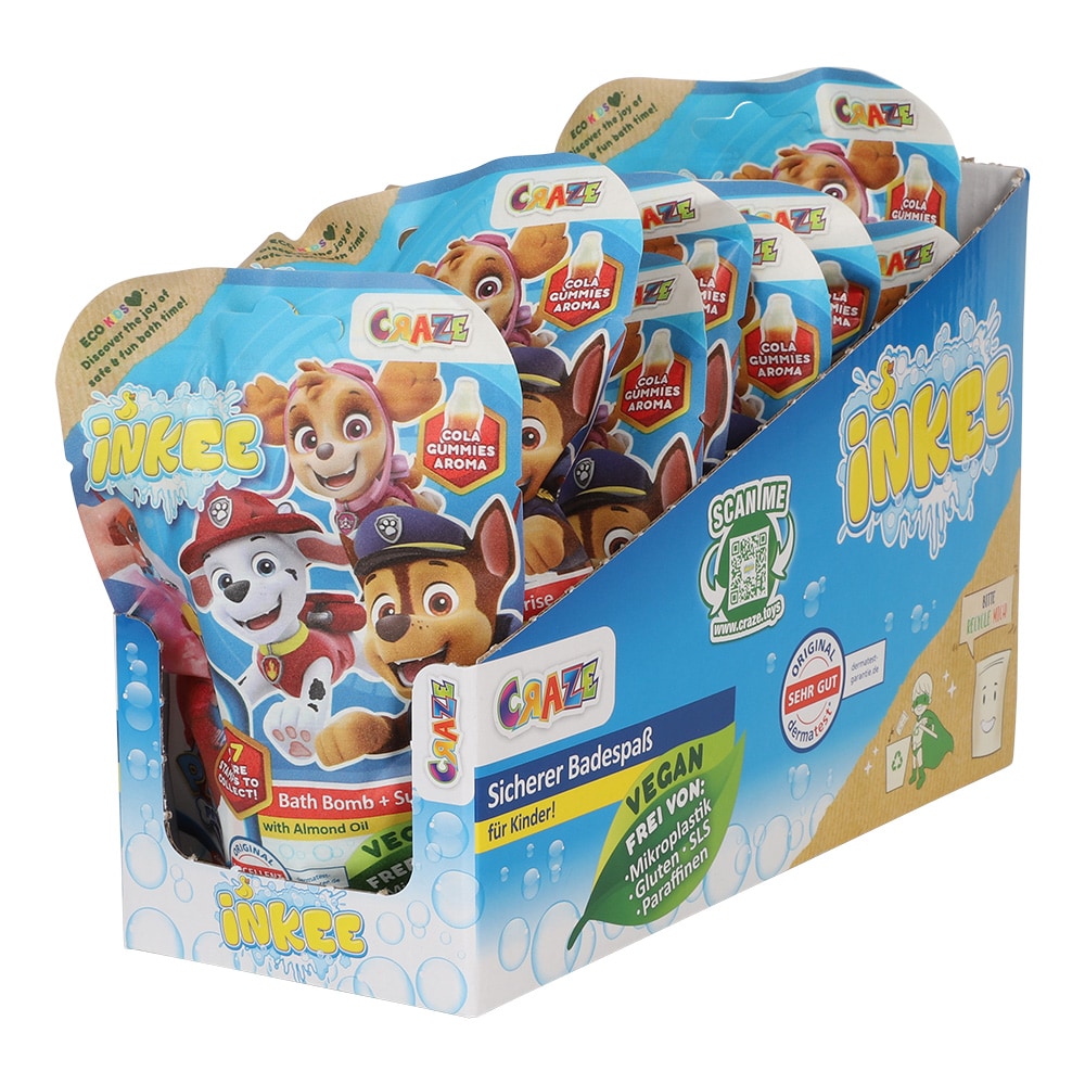 Sjov badebombe med lækker popcornaroma, og som farver badevandet i orange eller blå farve. Indeni badebomben er der også en overraskelse i form af en Paw Patrol-figur, der forestiller en af syv forskellige karakterer.