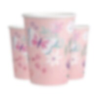 8 lyserøde papirkrus, med hvide kanter og med motiver af smukke sommerfugle, der er omringet af blomster. Gør bordpyntet ekstra flot med disse. Krusene er ca. 10 cm høje og rummer ca. 250 ml.