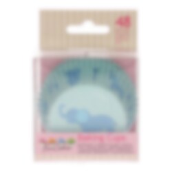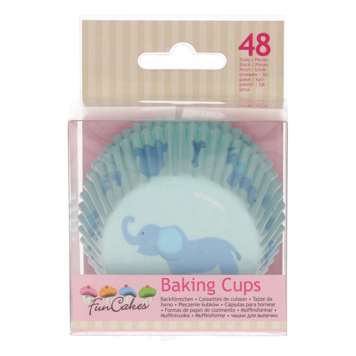 48 søde muffinforme i blå nuancer med elefantmotiv.