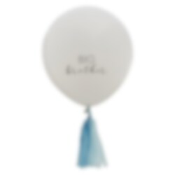 Flot stor hvid ballon med teksten ''Big Brother'' og med blå kvaster. Ballonen bliver 45 cm i diameter ved oppustning og du får 2 stk. blå kvaster.