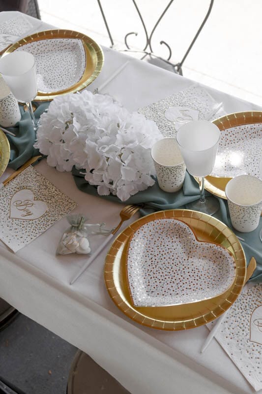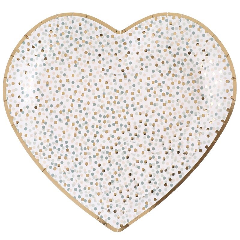 10 stk. hvide papkrus med dekorative prikker i grønt og guld. Krusene er smukke at dække med, når det er tid til en babyshower eller en dåb.