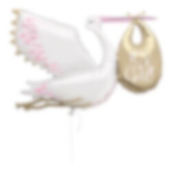 En mægtig fin folieballon, der repræsenterer en hvid stork med guld og lyserøde folie detaljer, medfølgende er en guldfolieret pose med påskriften "It's a girl" i hvid.
