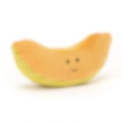 Tøjdyr i form af en skive cantaloupe melon med et glad smil. En sjov og frugtig ting, som ikke mange andre har. melonskiven kan også bruges, når man spiller butik, køkken eller andre lignende spil. Lavet af 95% polyester, 5% spandex og håndvaskes efter behov.