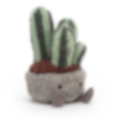 En livlig og glad kawaii-inspireret lille kaktus i en lav potte med et glad smil og små ben. Den perfekte ledsager til at sætte liv på dit skrivebord eller værelse. Denne smukke sukkulent med fire korte stribede spir i forskellige højder står i fluffy brun pels i en filtet grå-beige potte, der vil få dig til at smile. En sjov dekoration, der også fungerer som et anderledes blødt stykke legetøj. Håndvask evt.