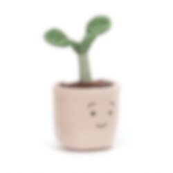 En sjov lille blød ven i form af en sund spire med to grønne blade i en glad lille krukke. Med ruskindsglat stilk, blade og potte, kælen brun jord og et broderet ansigtsudtryk kan denne sprælske lille plante sætte gang i forårsfølelser. Denne flotte lille plante skal ikke vandes og er rigtig god til at lyse dine omgivelser op. Fremstillet af polyester og kan håndvaskes og fladt eller hænges tørt efter behov.