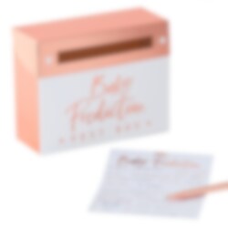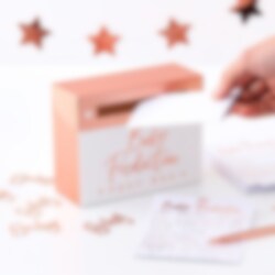 Fint og sjovt sæt med en stemmeboks i rosaguld og 20 tilhørende "gæt babyen"-kort, som dine gæster kan udfylde til dit babyshower. På kortene kan gæsterne blandt andet gætte på den kommende babys længde, vægt og fødselsdato, samt give små råd og tips. Det er en hyggelig og sjov aktivitet til dit babyshower og en fin gave at have med når man er gæst.