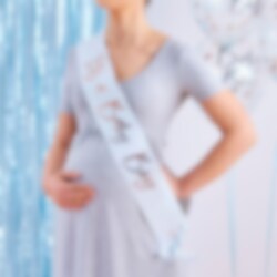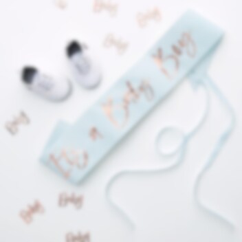 Vidunderligt blåt sash, der gives til kommende mor til sit babyshower! Sashen er blå med en fin tekst i rosaguld. Sashen er 75 cm (fra skulder til hofte) og 10 cm bred.