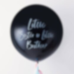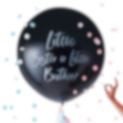 Stor og fin sort ballon med et motiv af teksten "Little Sister or Little Brother?". En sjov dekoration at have med til en Gender reveal fest eller et Babyshower. Pakken indeholder, udover ballonen også en blå og lyserød papirskonfetti og 1 lyserød tassel og 1 blå tassel, som du kan fastgøre under ballonen.
