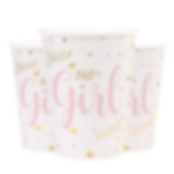 10 papkrus i hvid med teksten Baby Girl og med motiver af fine detaljer i rosa farve og guldfolie. Et fint tilbehør til at have og dække bordet til baby shower eller barnedåb. Passer godt sammen med vores andet tilbehør fra samme tema. Krusene er ca. 9,7 cm høje og har et rumindhold på 270 ml.