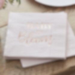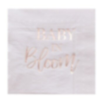 16 lyserøde servietter, med teksten "Baby in Bloom" stående, på den ene side, i rosaguldfolie. Dejlig bordpynt til babyshoweret. Servietterne er 2-lags og er ca. 33 x 33 cm store når de er udfoldede.