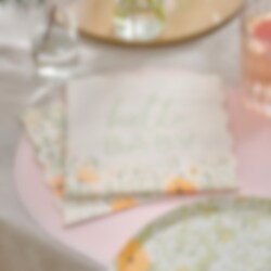 16 stk. smukke og sommerlige servietter, der er et perfekt supplement, når du dækker op til en babyshower. Servietterne giver dit bord en smuk blomstret touch. Servietterne har 2 lag og er udfoldede 30 x 30 cm store.