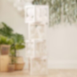 Dekoration har 4 stk. hvide blokke med vinduer, der fyldes med hvide balloner og den hvide tekst "Baby" på ydersiden. En smuk dekoration fra temaet Botanisk Baby, men som på grund af sit enkle og elegante udseende også passer godt sammen med andre babyshower-temaer. Fyld blokkene med balloner, påsæt bogstaverne og placer dekorationen et passende sted inden babyshoweret eller dåbsfesten. Blokkene er ca. 30 x 30 cm store.