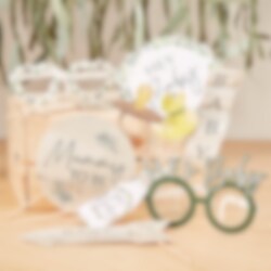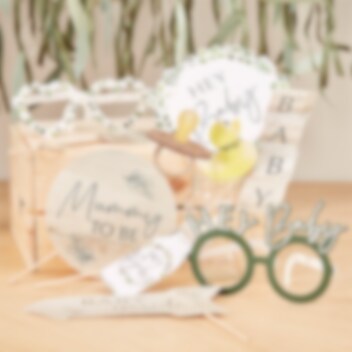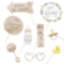 10 stk. photoprops i pæne farver med forskellige babyrelaterede motiver. Du og dine gæster kan bruge disse til at tage sjove billeder under babyshoweret.