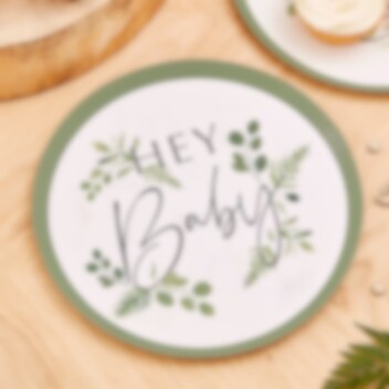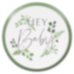 8 stk. grønne og hvide paptallerkener med temaet Botanical Baby med motiver af kviste og blade samt teksten "Hey Baby" i mørkegrå. Perfekt til borddækningen ved babyshoweret eller dåbsfesten. Tallerkenerne er miljøvenlige og har en diameter på ca. 24 cm.