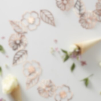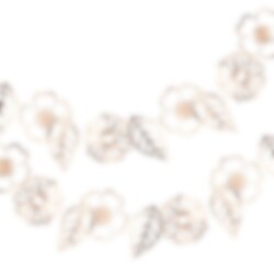 Eksklusiv guirlande med at 18 motiver af blomster og blade i en fin rosaguld farve. En imponerende dekoration at have med til festen eller dit Baby Shower. Guirlanden er ca. 3 meter lang.