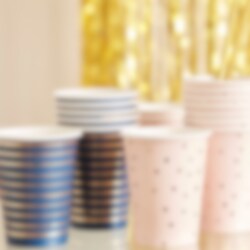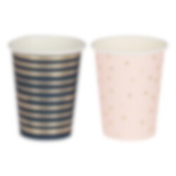 8 stk. papkrus i lyserøde og mørkeblå farver med guld-folierede prikker og striber. Brug disse i bordopdækningen til din Gender Reveal-fest. Krusene er ca. 10 cm høje og rummer ca. 250 ml.