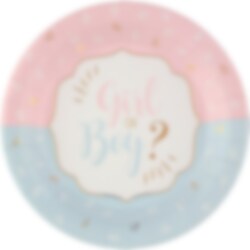 10 flotte paptallerkener i blå og lyserød med teksten Pige eller dreng? og med andre smarte detaljer i guldfolie. Perfekt, hvis det er tid til en kønsafsløringsfest. Tallerkenerne er ca. 22,5 cm i størrelse.