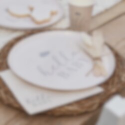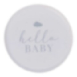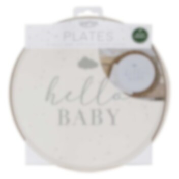 8 stk. papirtallerkener i en flot neutral beige farve og med motiver af skriften "Hello Baby" i grå. En flot borddækning som supplement til dit baby shower. Tallerkenerne er omkring 24 cm i diameter.