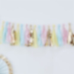 Dekorativ guirlande med blandede kvaster i fine guld og pastelfarver. Guirlanden er nem at sætte op og i pakken medfølger der 16 kvaster af papir og folie samt en snor på 2 meter.