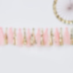 Sød guirlande med forskellige kvaster i pink og guld. En rigtig flot udsmykning til Babyshoweret. Guirlanden har i alt 16 kvaster og er omkring 2 meter lang.