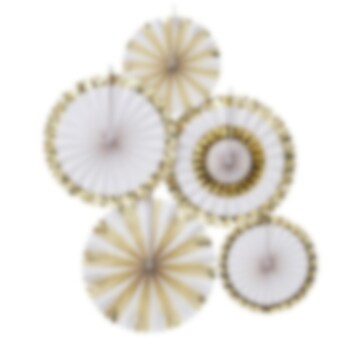 5 stk. fine dekorationsmåner eller vifter som de også kaldes, der medfølger 3 store og 2 små. Vifterne er delvist hvide med kanter af skinnende guldfolie.