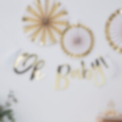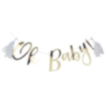 Stor guirlande i guldfolie med teksten Oh Baby og to hvide kvaster. En dekorativ ting at op til babyshower med. Guirlanden er omkring 150 cm lang.