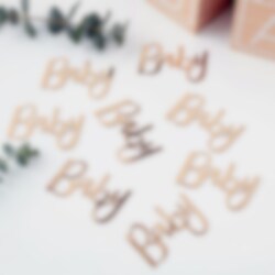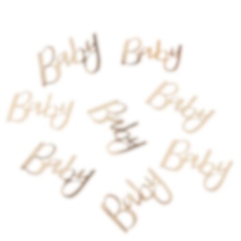 Pakke med konfetti i guldfolie med ordene Baby. Flot at dekorere bordet med til babyshower. Pakningen indeholder 14 gram.