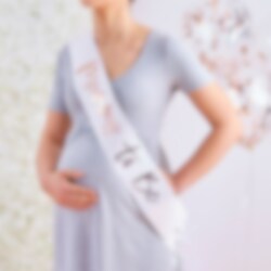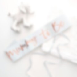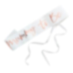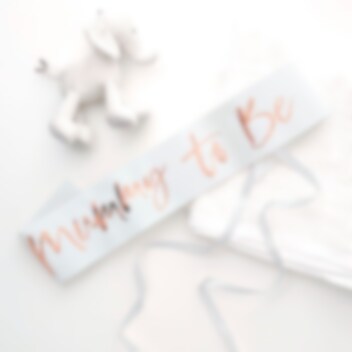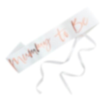 Smukt sash som den fremtidige mor kan have på til sit babyshower. Sashen er hvid, med tekst i rosaguld. Den er ca. 75 cm lang og 10 cm bred.