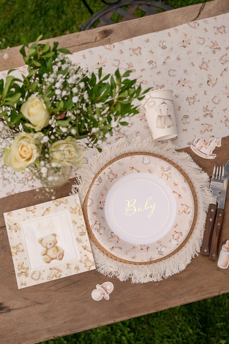 Fine paptallerkener fra Little Teddy-serien, som passer lige så godt til babyshower som til dåb og andre fejringer for den lille. Den dekorative kant med bamser og små detaljer fra barnets første tid er fremhævet med skinnende guldfolie, som også indrammer den centrale tekst 'Baby' og giver borddækningen en elegant følelse.