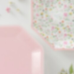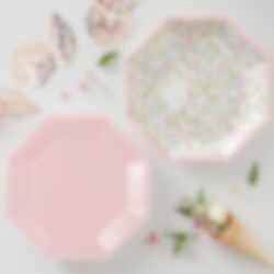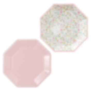 8 stk. paptallerkener i 2 forskellige designs, 4 af tallerkenerne er i lyserød farve, og de resterede 4 er med blomstermotiv. Tallerkenerne har en diameter på omkring 23 cm.