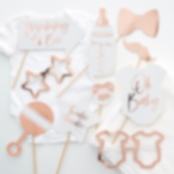 Pakke med 10 stk. forskellige photoprops i rosaguld med flotte baby motiver. Brug disse, når du og dine gæster skal til at tage nogle mindeværdige billeder under dit baby Shower.